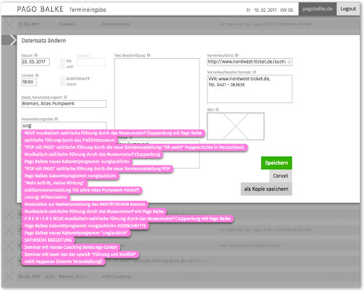 Der neue Internet Auftritt von Pago Balke. Zentrales Thema: Darstellung der aktuellen Auftrittstermine. Die Seite wird